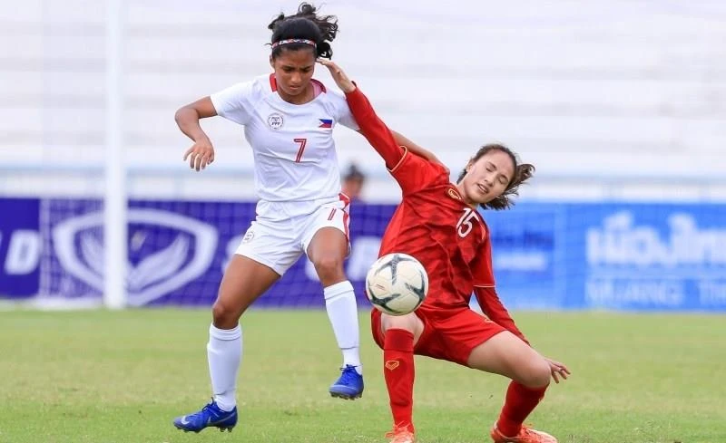 Nữ Việt Nam trong trận thắng Philippines 2-1 ở bán kết.