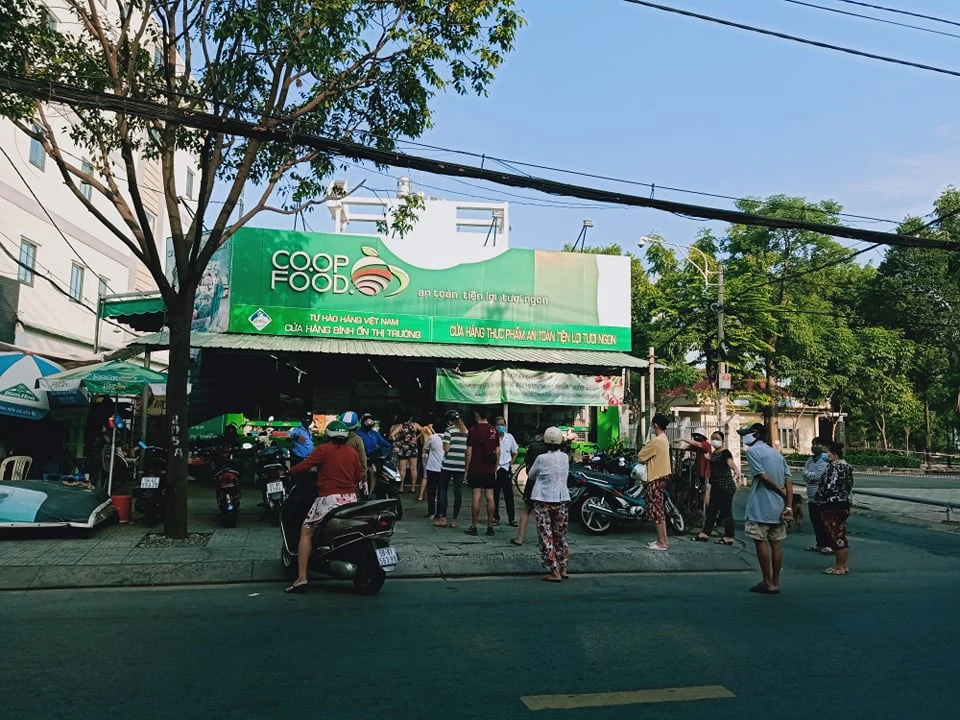 Từ tờ mờ sáng, người dân tại Gò Vấp đã xếp hàng trước Co.op Food để mua hàng trước tin đồn dừng toàn bộ hoạt động giao hàng. Ảnh: Thu Hà
