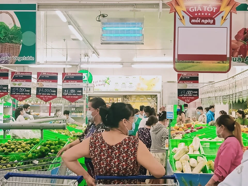 Người dân đổ xô vào siêu thị để mua hàng tại siêu thị Mega Market sáng 14-7, khiến quầy rau củ kẹt cứng. Ảnh: Thu Hà