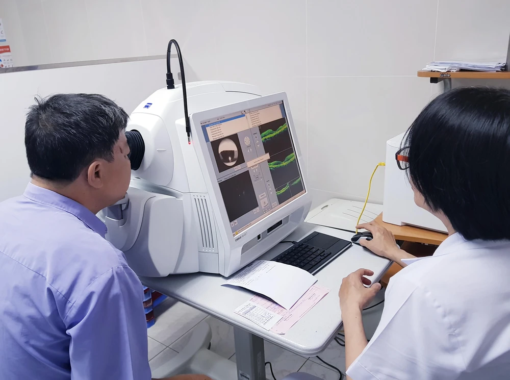 Một bệnh nhân đang được khám mắt bằng hệ thống chụp cắt lớp võng mạc. Ảnh: BV MẮT TP.HCM