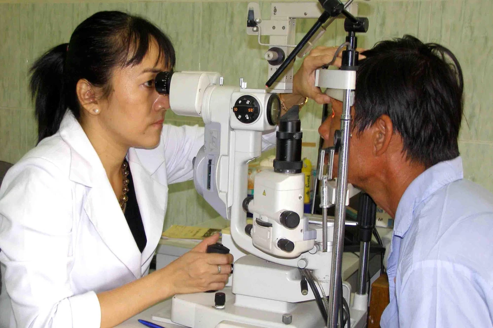 Khám mắt cho một bệnh nhân bị đục thủy tinh thể. Ảnh: TRẦN NGỌC