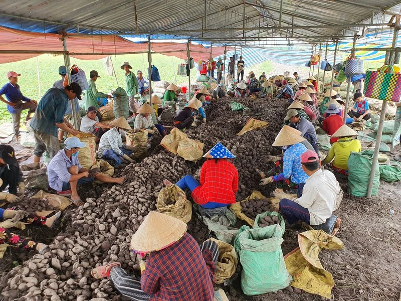 Bà con trồng khoai lang ở Vĩnh Long đang khốn khổ vì khoai lang rớt giá. Ảnh: HẢI DƯƠNG-CHÂU ANH.