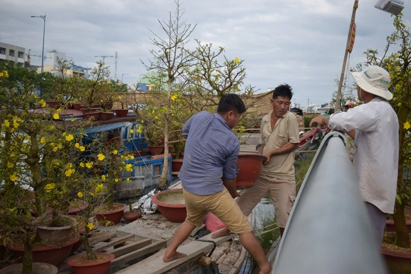 Nhọc nhằn bưng từng chậu mai lên bờ bán. Ảnh: NGUYỄN TRÀ.