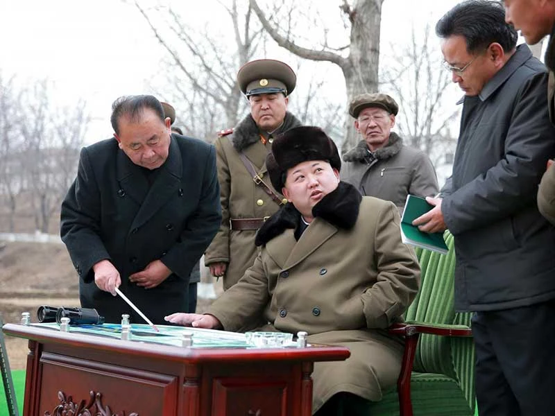 Ông Kim Jong-un cùng các tướng lĩnh tại một buổi phóng thử tên lửa. Ảnh: AFP