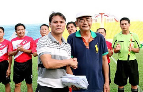 Nghệ sĩ Việt Anh đại diện các cầu thủ Cựu Sinh viên TP.HCM và Trần Tấn Thông. Ảnh: SGGP