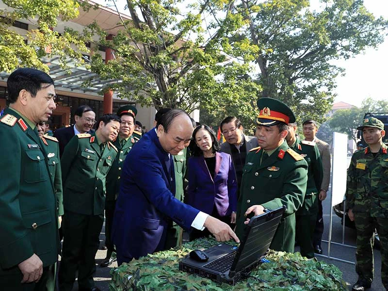 Thủ tướng Nguyễn Xuân Phúc và các đại biểu tham quan trưng bày vũ khí, khí tài tại hội nghị. Ảnh: TTXVN