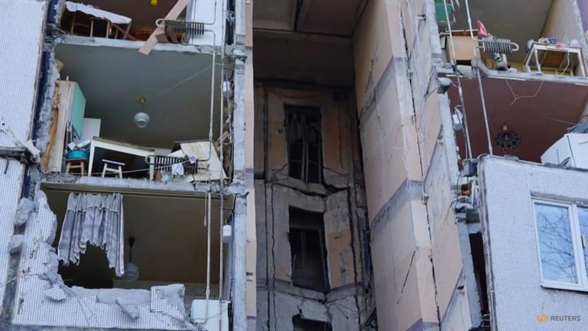 Một tòa nhà dân cư bị hư hỏng nặng sau các cuộc không kích của Nga. Ảnh: REUTERS