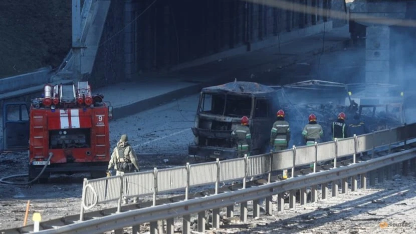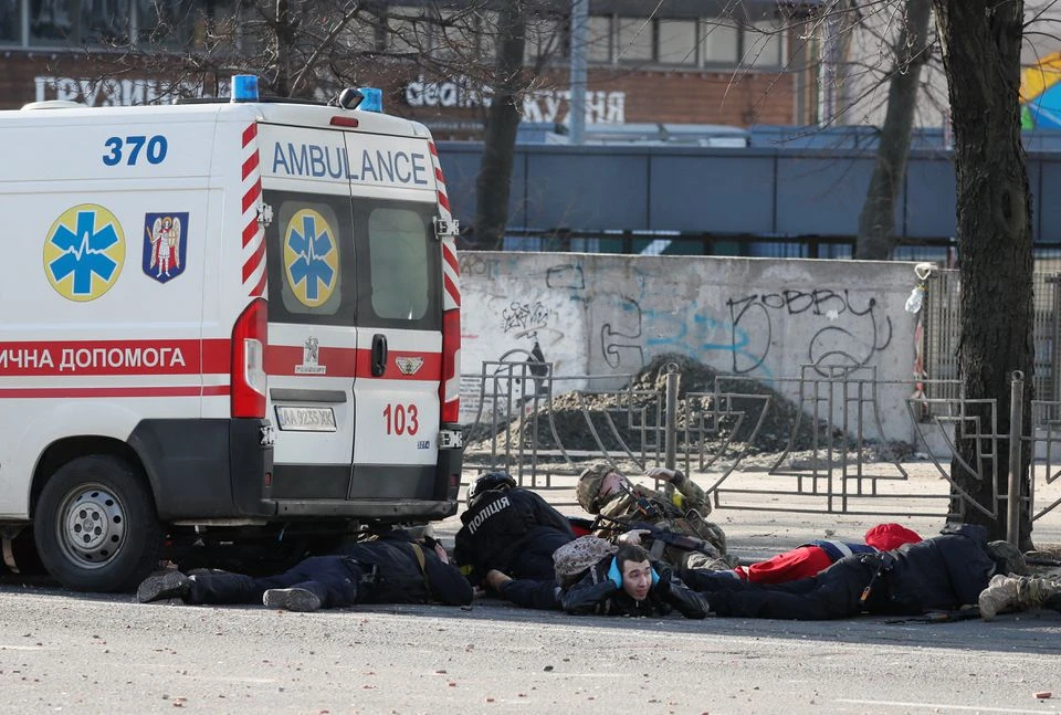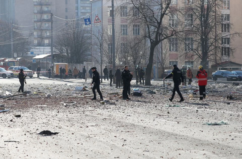 Cảnh sát và lực lượng khẩn cấp có mặt tại một tòa nhà để hỗ trợ người dân sau trận pháo kích của Nga vào ngày 26-2. Ảnh: REUTERS
