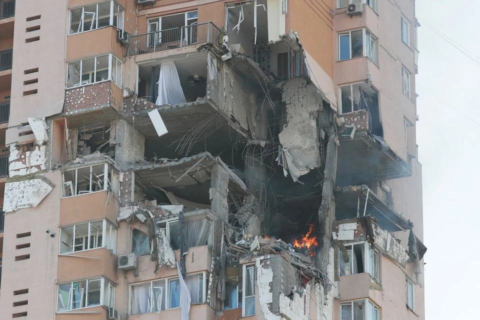 Một tòa nhà chung cư bị hư hại nặng do trận pháo kích của Nga ở Kiev vào ngày 26-2. Ảnh: REUTERS