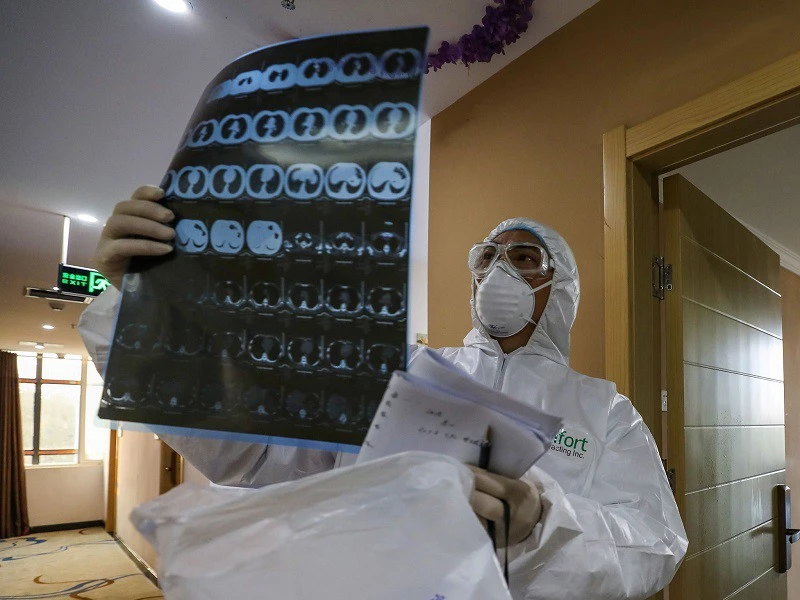 Một bác sĩ ở Vũ Hán (Trung Quốc) xem xét hình chụp phổi của bệnh nhân nhiễm COVID-19. Ảnh: AFP