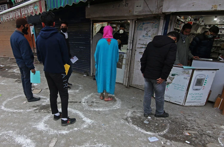 Người dân Ấn Độ buộc phải đứng trong từng ô vẽ sẵn để giữ khoảng cách khi đến mua thuốc tại hiệu thuốc ở thành phố Srinagar, bang Kashmir hôm 26-3. Ảnh: GETTY