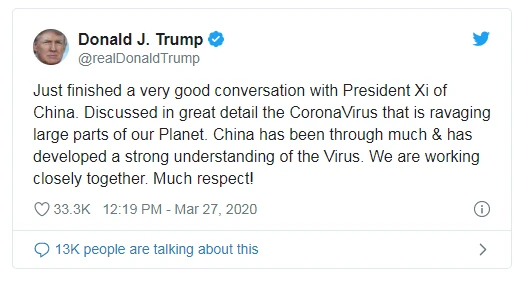 "Tôi vừa có một cuộc trao đổi tốt đẹp với Chủ tịch Trung Quốc Tập Cận Bình. Nội dung cuộc nói chuyện về virus Corona (tức virus SARS-CoV-2) đang lan rộng khắp toàn cầu. Trung Quốc đã có nhiều sự hiểu biết về loại virus này. Chúng tôi đang làm việc chặt chẽ với nhau" - ông Trump đăng trên Twitter.