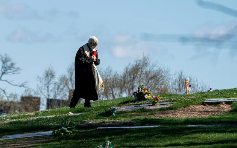 Một mục sư đeo khẩu trang đi vào nghĩa trang Green Wood ở TP New York, Mỹ. Ảnh: REUTERS