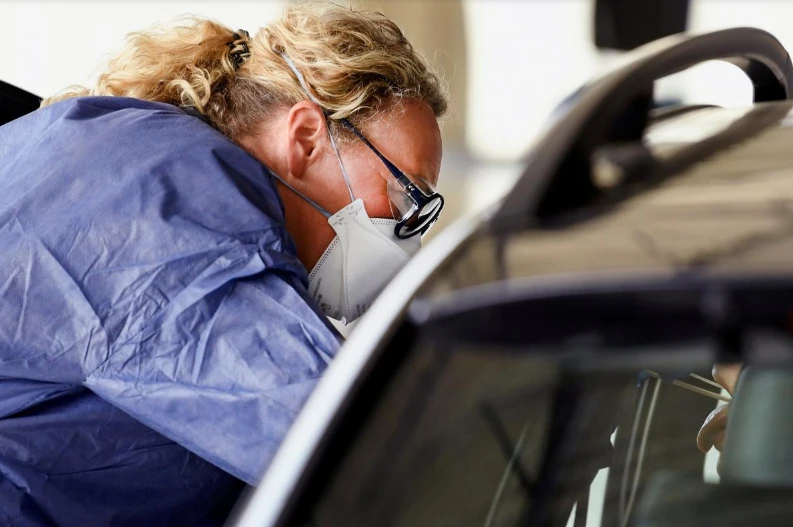 Một nhân viên y tế lấy mẫu xét nghiệm COVID-19 cho bệnh nhân tại một sân băng được chuyển đổi thành khu lấy mẫu xét nghiệm nhanh ở TP Alkmaar, Hà Lan. Ảnh: REUTERS
