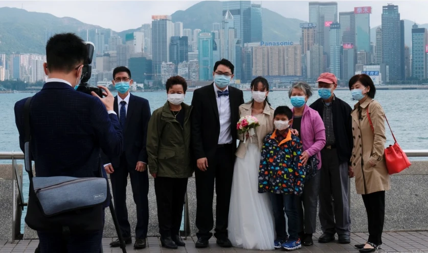 Một cặp vợ chồng mới cưới cùng người thân đeo khẩu trang chụp ảnh tại Tsim Sha Tsui (Hong Kong). Ảnh: REUTERS
