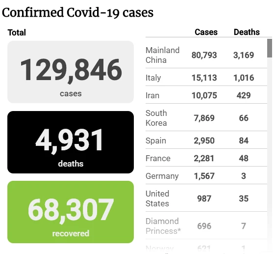 Báo South China Morning Post (SCMP) dẫn số liệu từ Ủy ban Y tế Quốc gia Trung Quốc (NHC) cho biết tính đến 6 giờ ngày 13-3, tổng số ca tử vong trên toàn cầu vì dịch viêm đường hô hấp cấp do virus Corona chủng mới (dịch COVID-19) gây ra là 4.931. Tổng số ca nhiễm là 129.846. Trên toàn thế giới có 68.307 ca chữa khỏi.