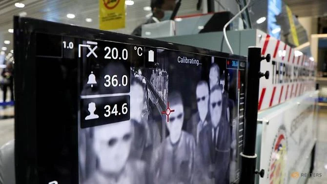 Một nhân viên kiểm dịch y tế Malaysia chờ hành khách tại một điểm kiểm tra thân nhiệt trong nhà ga quốc tế của sân bay Kuala Lumpur ở Sepang (Malaysia). Ảnh: REUTERS