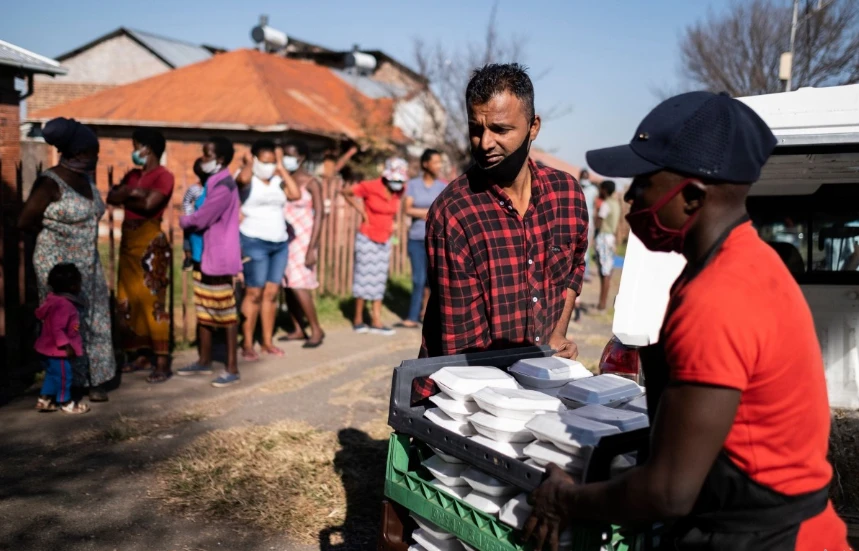 Các thành viên của một hội từ thiện địa phương phân phát thức ăn ở Vrededorp, ngoại ô TP Johannesburg, Nam Phi. Ảnh: AFP