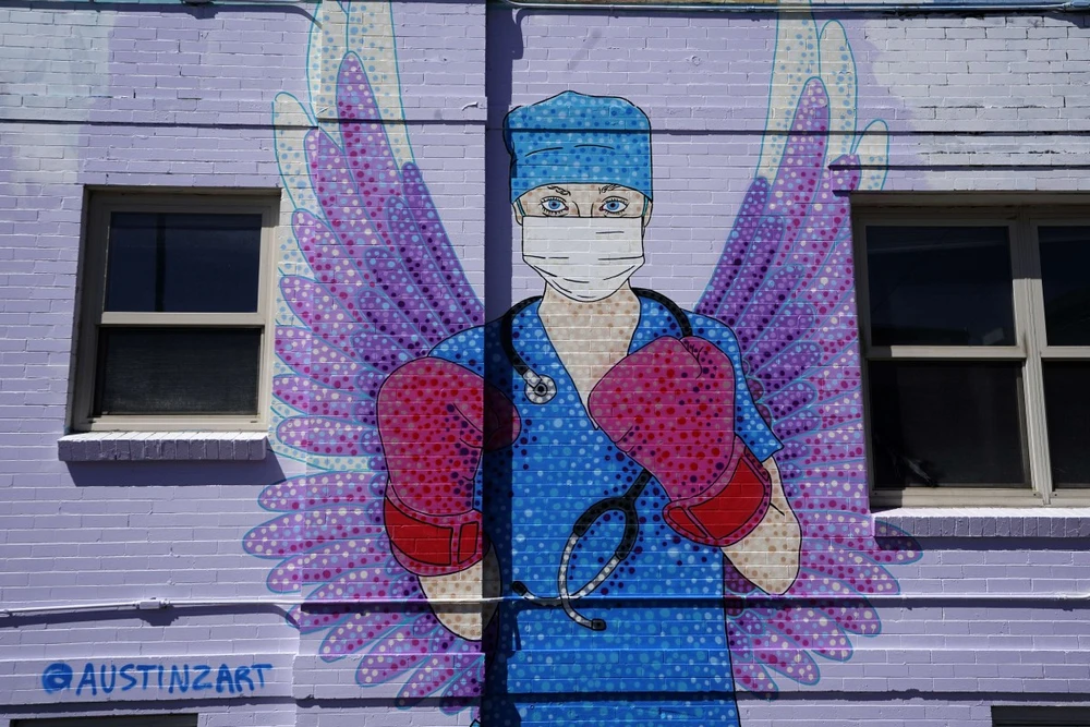 Một bức tranh được vẽ trên tường mô tả một nhân viên y tế ở TP Denver, bang Colorado của Mỹ. Ảnh: AFP