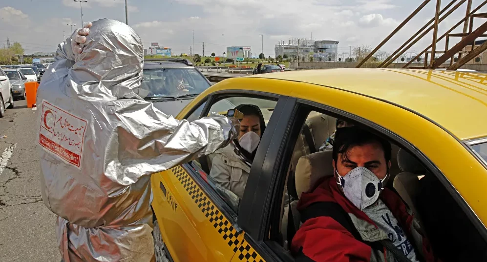 Các thành viên Lưỡi liềm đỏ của Iran đo thân nhiệt người dân tại một đường cao tốc bên ngoài thủ đô Tehran. Ảnh: AFP