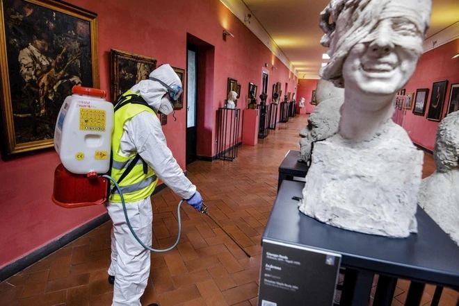 Nhân viên thực hiện phun khử trùng tại một bảo tàng ở Naples, Ý hôm 10-3. Ảnh: AP.