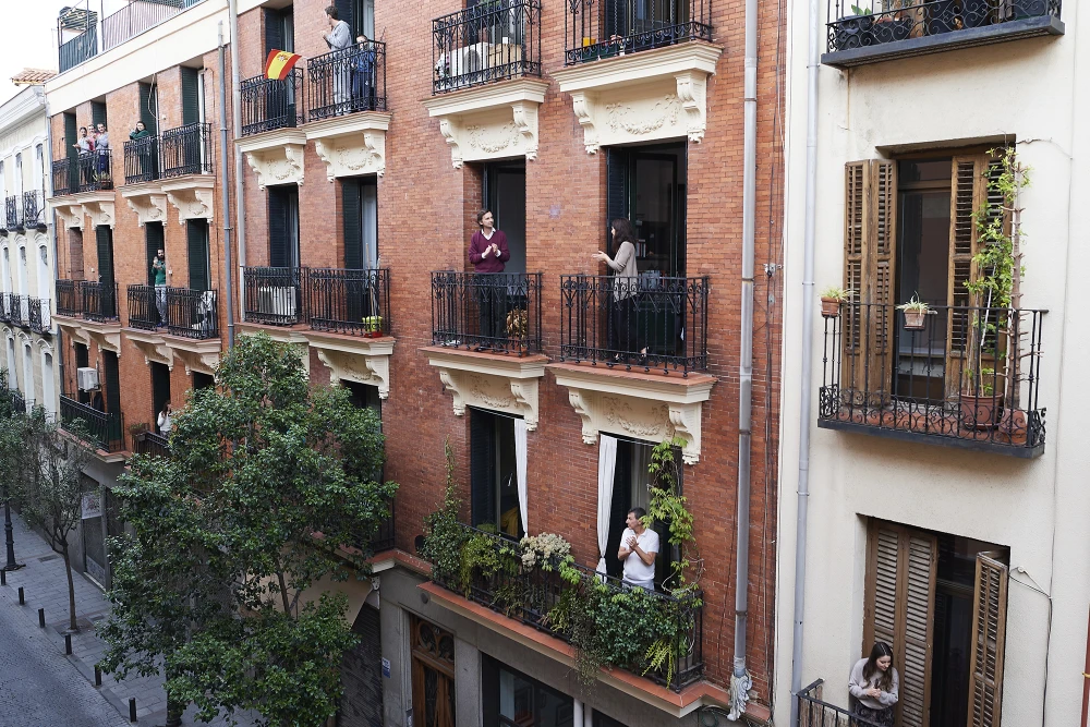 Người dân đứng trên ban công tỏ lòng biết ơn các nhân viên y tế trong cuộc chiến chống COVID-19 ở Madrid, Tây Ban Nha. Ảnh: GETTY