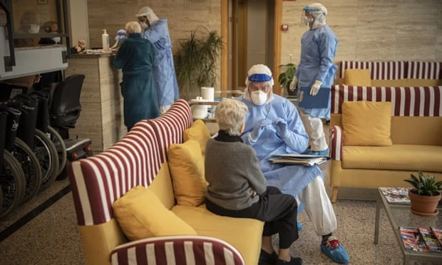 Nhân viên cứu trợ thuộc một tổ chức phi chính phủ của Tây Ban Nha nói chuyện với một cụ bà trước khi bắt đầu xét nghiệm COVID-19 tại nhà dưỡng lão ở Barcelona. Ảnh: AP