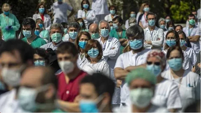 Các nhân viên y tế dành 1 phút mặc niệm tưởng nhớ BS Joaquin Diaz - trưởng Khoa phẫu thuật của Bệnh viện La Paz ở Madrid (Tây Ban Nha), đã qua đời vì COVID-19. Ảnh: AP