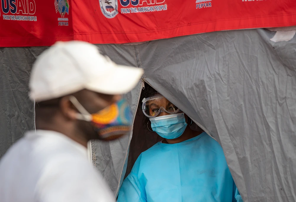 Một nhân viên y tế tại một điểm xét nghiệm COVID-19 ở thị trấn Tembisa, TP Johannesburg, Nam Phi. Ảnh:Themba Hadebe /AP