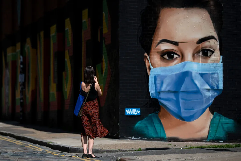 Một phụ nữ đang chụp lại bức chân dung một nữ bác sĩ được vẽ trên bức tường ở đường Brick Lane, thủ đô London (Anh) vào ngày 23-4. Ảnh: GETTY IMAGES