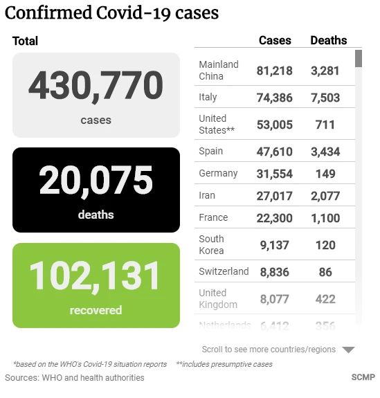 Tính đến 7 giờ sáng 26-3, tờ South China Morning Post thống kê toàn thế giới có 20.075 người tử vong vì đại dịch viêm đường hô hấp cấp do virus SARS-CoV-2 gây ra (tên chính thức là đại dịch COVID-19), 430.770 ca nhiễm.