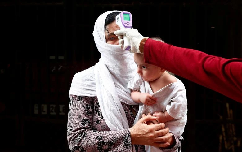 Nhân viên y tế đang đo thân nhiệt cho một phụ nữ ở New Delhi, Ấn Độ vào ngày 20-4. Ảnh: REUTERS