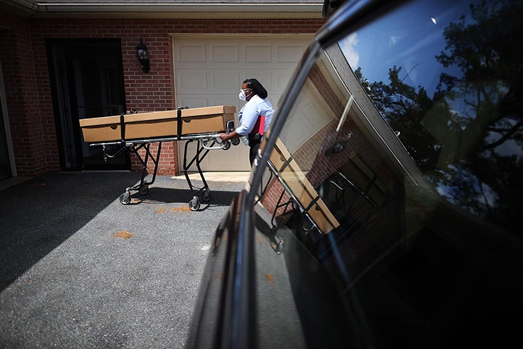 Một nhân viên y tế Mỹ đưa bệnh nhân tử vong vì COVID-19 ra ngoài. Ảnh: AP