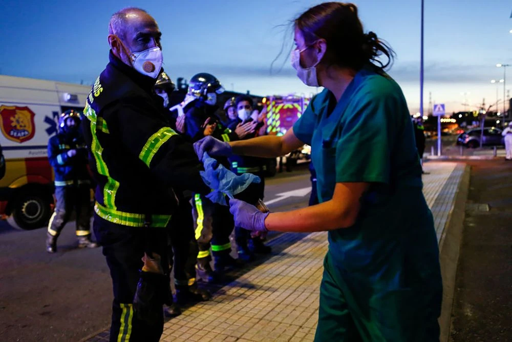 Một công nhân vệ sinh buộc một lớp bảo vệ vào tay một lính cứu hỏa như biểu tượng của lòng biết ơn vì sự hỗ trợ của họ trong cuộc khủng hoảng COVID-19 ở Madrid, Tây Ban Nha. Ảnh: GETTY