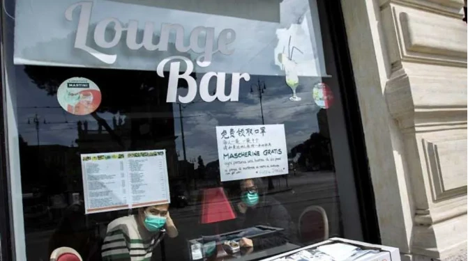 Nhân viên một quán bar Trung Quốc được phát miễn phí khẩu trang ở Rome (Ý). Ảnh: AFP