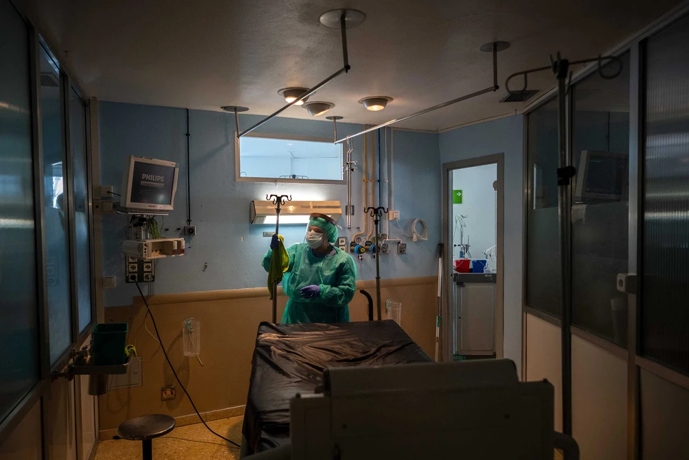 Khử trùng một phòng bệnh sau khi một bệnh nhân qua đời vì COVID-19 tại BV ĐH Bellvitge, gần Barcelona (Tây Ban Nha). Ảnh: GETTY