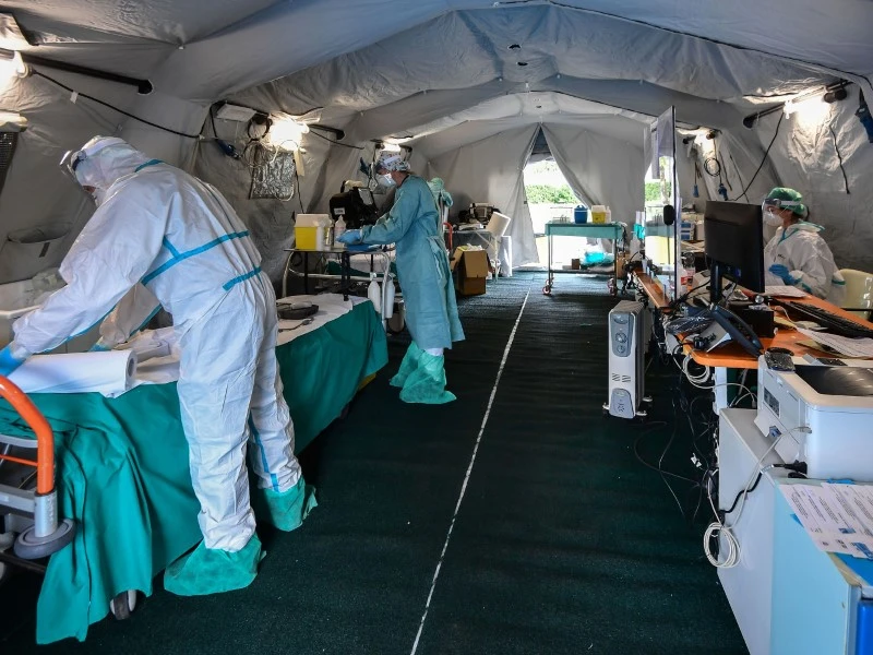 Nhân viên y tế tại một lều cách ly dã chiến ở TP Milan, Ý ngày 12-3. Ảnh: REUTERS