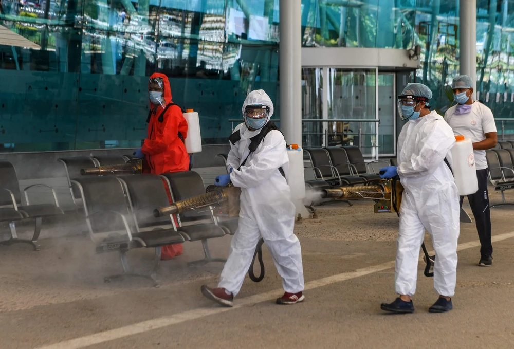 Tình nguyện viên phun thuốc khử trùng tại sân bay quốc tế Sri Guru Ram Dass Jee ở TP Amritsar, Ấn Độ ngày 15-5. Ảnh: AFP