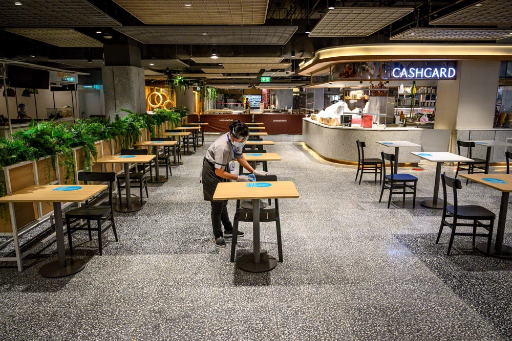 Một nhân viên đeo khẩu trang đang dọn dẹp tại khu ẩm thực của trung tâm mua sắm ở Bangkok, Thái Lan. Ảnh: REUTERS