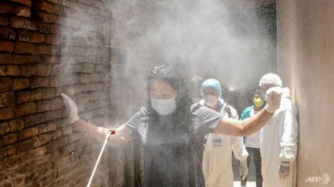 Nhân viên y tế Nepal mặc đồ bảo hộ xịt khử trùng một phụ nữ. Ảnh: AFP