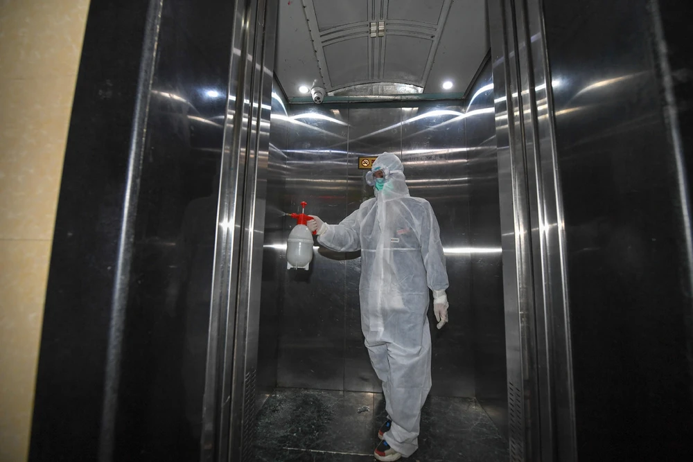 Nhân viên công cộng phun khử trùng thang máy ở TP Thư Lan, tỉnh Cát Lâm, Trung Quốc. Ảnh: TÂN HOA XÃ