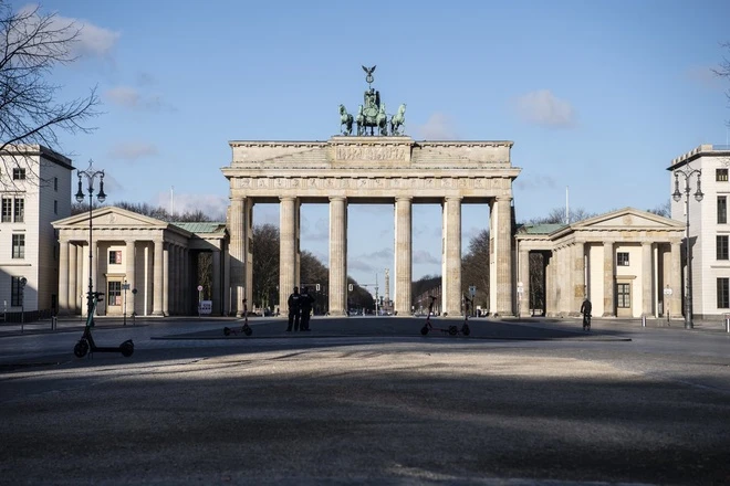 Cảnh sát đứng canh ở cổng Brandenburg ở thủ đô Berlin sáng 21-3. Ảnh: AP