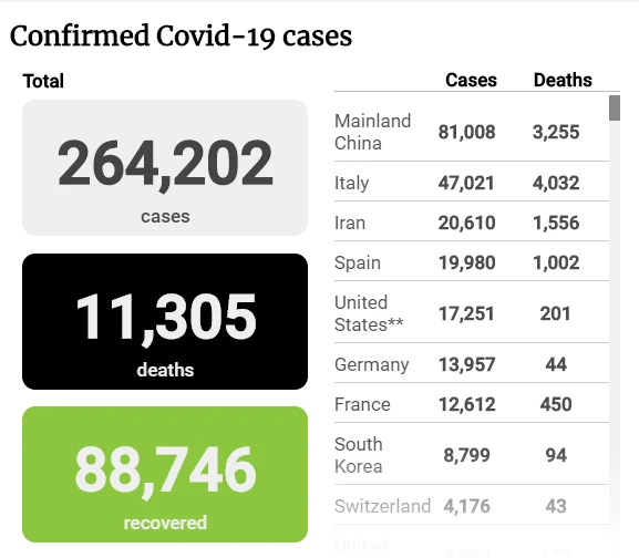 Báo South China Morning Post (SCMP) dẫn số liệu từ Ủy ban Y tế Quốc gia Trung Quốc (NHC) cho biết tính đến 19 giờ 20 ngày 21-3, tổng số ca tử vong trên toàn cầu vì dịch viêm đường hô hấp cấp do virus SARS-CoV-2 gây ra (dịch COVID-19) là 11.305. Tổng số ca nhiễm là 264.202. Có 88.746 ca được chữa khỏi.