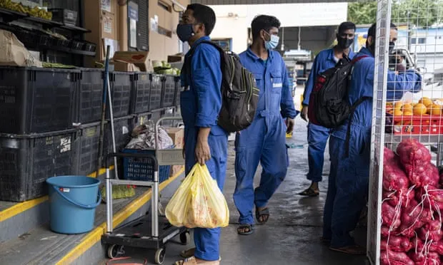Những người lao động nước ngoài đeo khẩu trang mua thực phẩm ở Singapore. Ảnh: GETTY