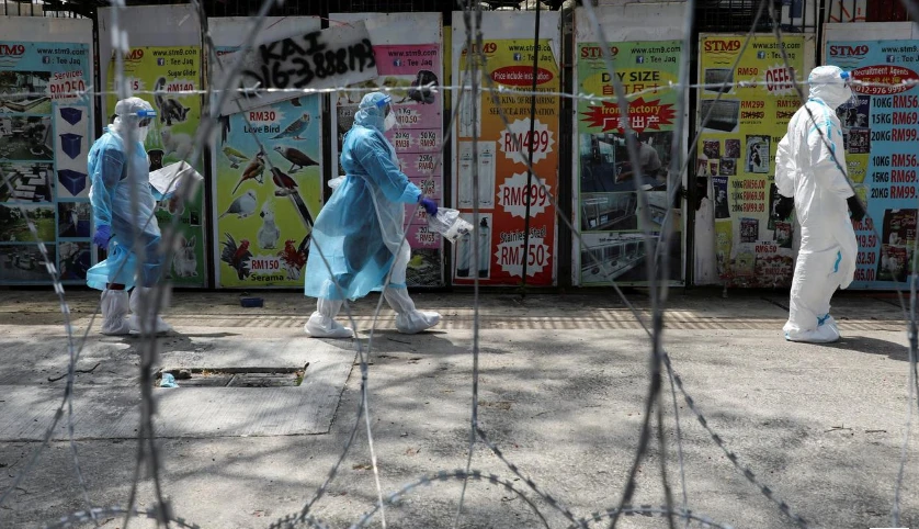 Nhân viên y tế đi ngang qua một khu vực đỏ (khu vực có nguy cơ lây nhiễm cao) được rào kẽm gai ở thành phố Petaling Jaya, Malaysia. Ảnh: REUTERS