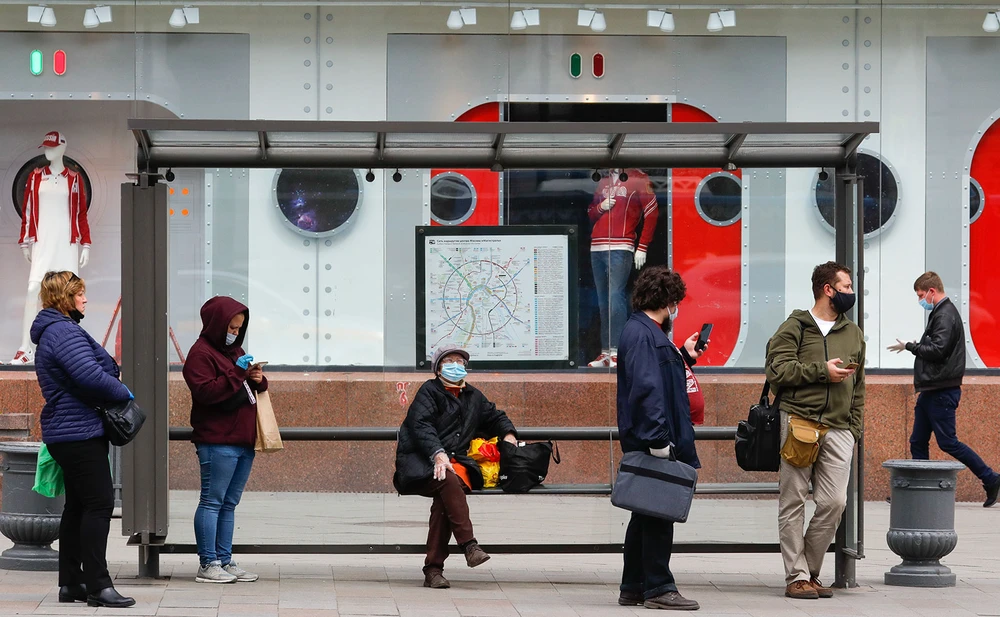 Người dân Moscow chờ xe buýt trong bối cảnh dịch COVID-19 đang bùng phát tại Nga. Ảnh: TASS