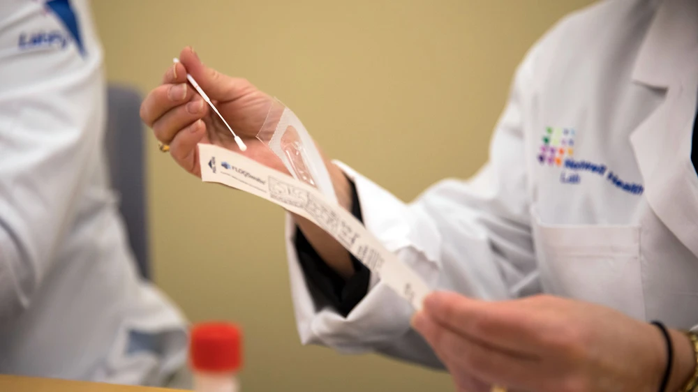 Một nhà nghiên cứu lấy mẫu xét nghiệm từ mũi bệnh nhân. Ảnh: GETTY