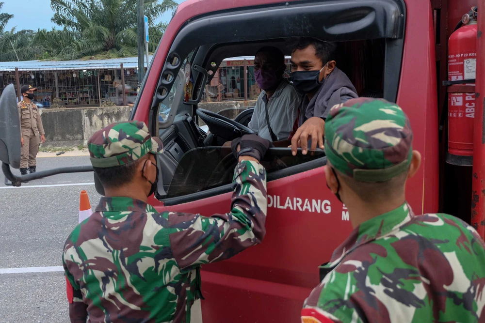 Binh sĩ kiểm tra việc chấp hành hạn chế đi lại trên một đường cao tốc ở TP Pekanbaru (Indonesia) ngày 22-4. Ảnh: GETTY IMAGES