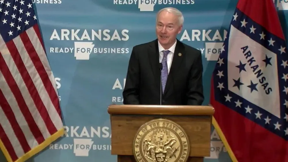Ông Asa Hutchinson, Thống đốc bang Arkansas, phát biểu tại buổi họp báo thông tin tình hình dịch COVID-19 của bang. Ảnh: VĂN PHÒNG THỐNG ĐỐC BANG