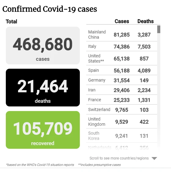Tính đến 7 giờ 30 tối 26-3, báo South China Morning Post thống kê toàn thế giới có 21.464 người tử vong vì đại dịch viêm đường hô hấp cấp do virus SARS-CoV-2 gây ra (tên chính thức là đại dịch COVID-19), 468.680 ca nhiễm.